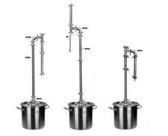 Как видим данный аппарат подразумевает абсолютно все варианты выгонки дистиллята и получения спирта. Приобретая данный аппарат его не нужно модернизировать в нём собраны все основные части для самогоноварения. Всё оборудование пристегивается соединение Кламп 2. В данной конструкции показаны только 7 основных вариантов сборки аппарата, а если приложить немного фантазии этот трансформер можно собирать как угодно. Главное все детали пристегиваются и отстегиваются. Также аппарат можно дополнить диоптром, арoma - корзиной и т. п. на соединениях Кламп.